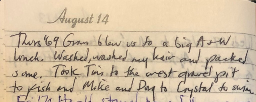 Gran treated us to a big A&W lunch. Washed, washed my hair and packed some. Took Tim to the west gravel pit to fish and Mike and Doug to Crystal to swim.