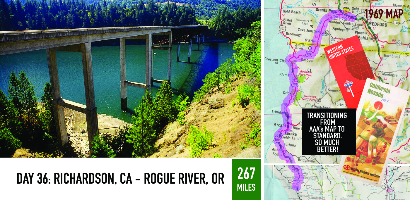 Packed and left. Got a late start. Drove north along the coast then into Oregon. Camped in a dusty park on the Rogue River. Jim didn’t like it.