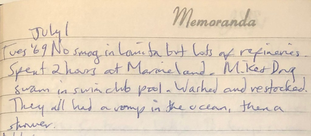 No smog in Lomita but lots of refineries. Spent 2 hours at Marineland. Mike & Doug swam in swim club pool. Washed and restocked. They all had a romp in the ocean, then a shower.