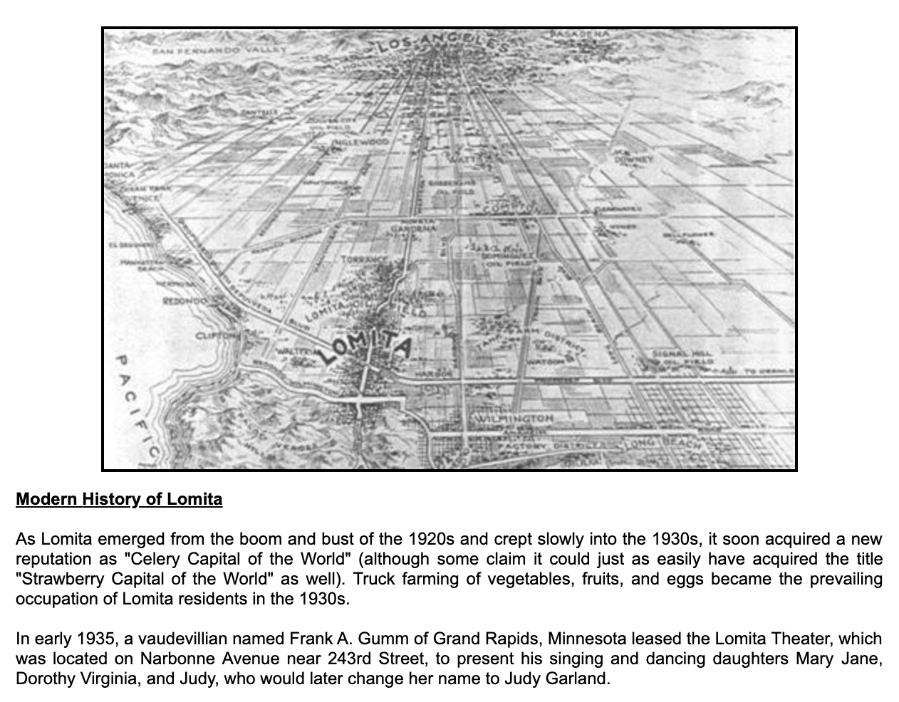 Here’s a screen grab from the Lomita website. I love the illustration of a proud and bustling Lomita surrounded by the fields that would soon rise high and shut out the bright lights of mighty Los Angeles.