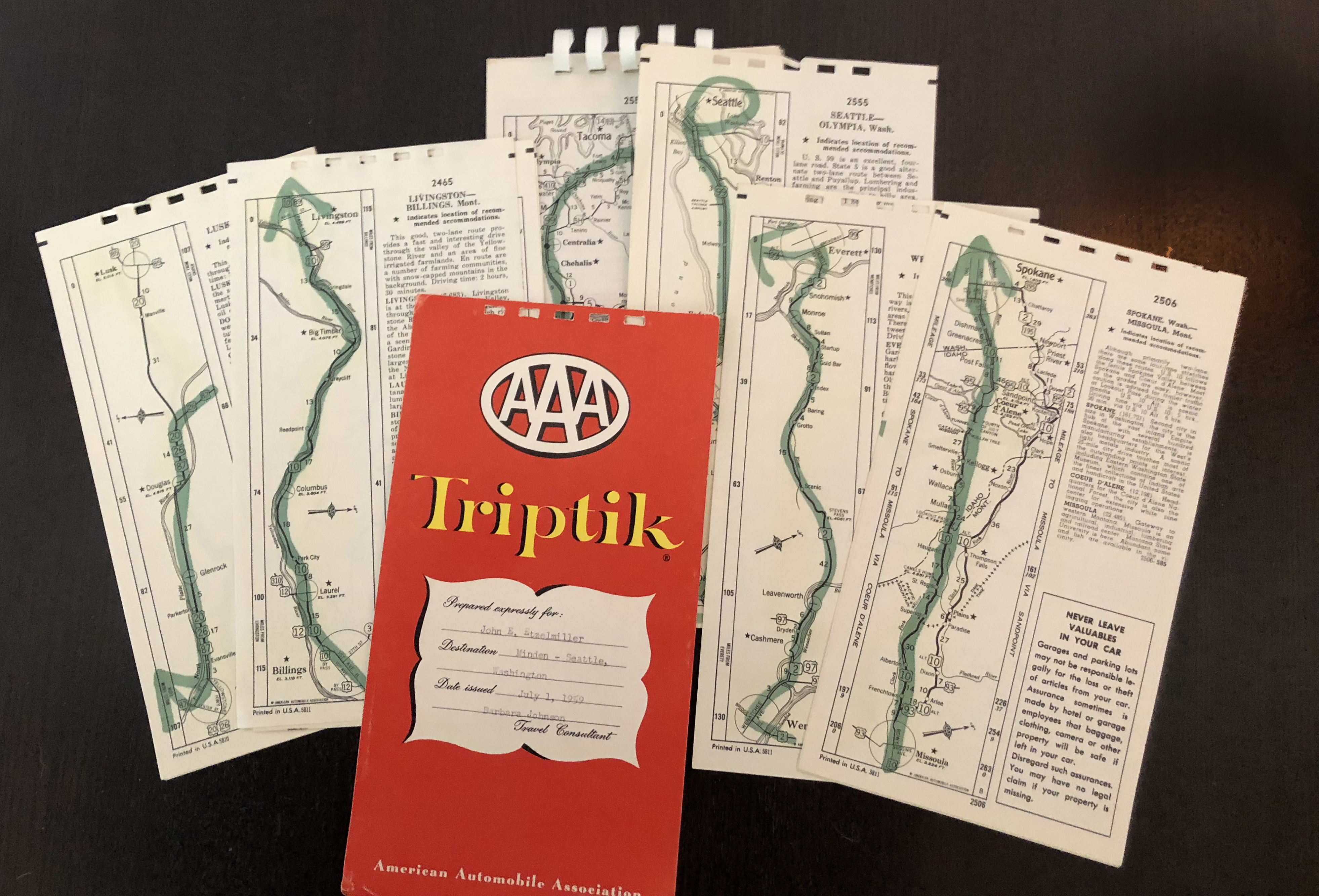 AAA also created Triptiks. These were customized, hand-marked and -assembled pamphlets of maps bound together in order of the trip. One page would get you from point A to B, the next from B to C, and so on. The pages had an odd configuration such that the route always went from top to bottom or vice versa, no matter the direction you were actually heading. Mom didn’t use a Triptik on this trip because I think she wanted to be open to diversions. She did call on them plenty of times for later trips.