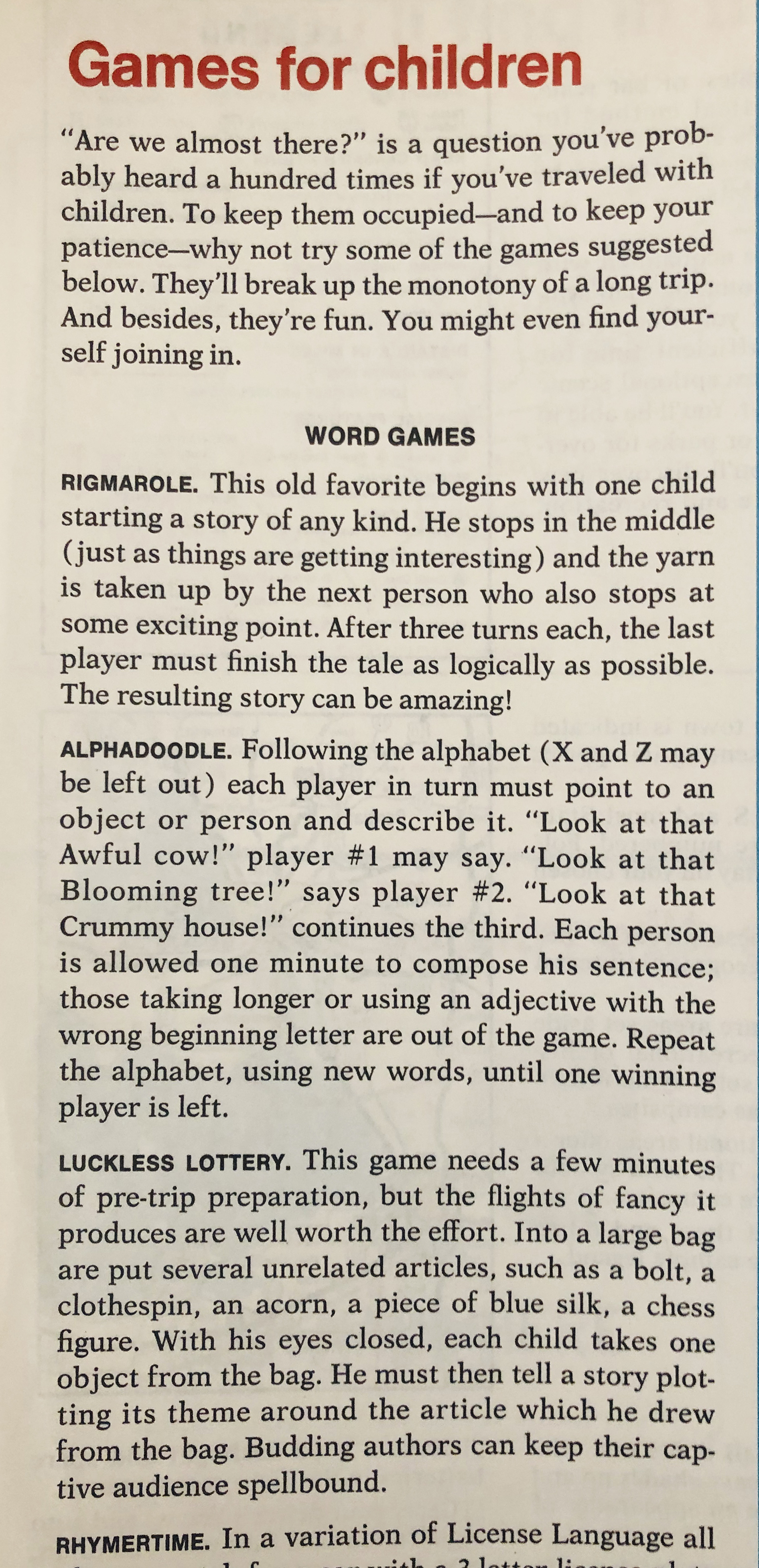 Here’s what AAA suggested families do for traveling with kids back in 1969, before video games, tablets and seat-back video screens. And phones, internets, etc. etc.