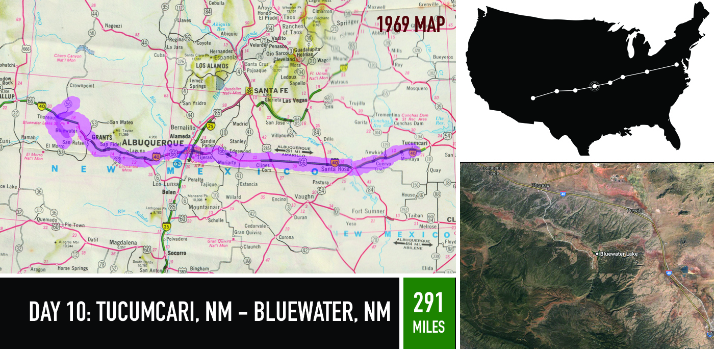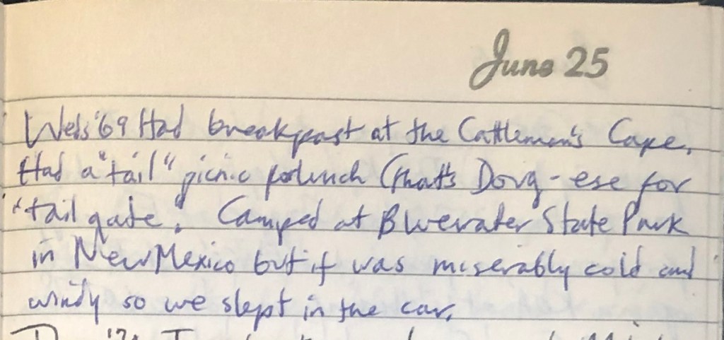 Had breakfast at the Cattleman’s Cafe. Had a “tail” picnic for lunch (that’s Doug-ese for “tailgate.” Camped at Bluewater State Park in New Mexico but it was miserable cold and windy so we slept in the car.