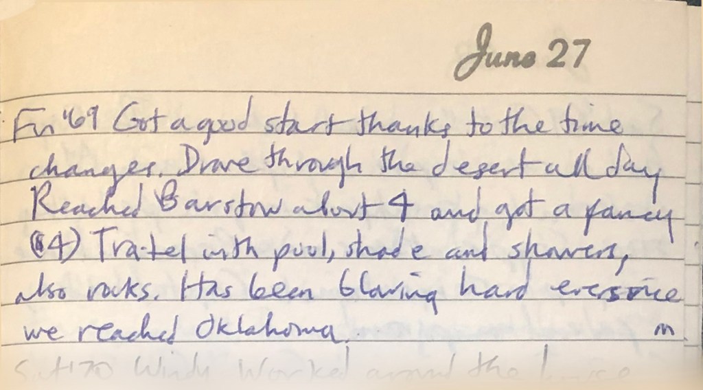 Got a good start thanks to the time changes. Drove through the desert all day. Reached Barstow about 4 and got a fancy ($4) tra-tel with pool, shade and showers, also rocks. Has been blowing hard ever since we reached Oklahoma.